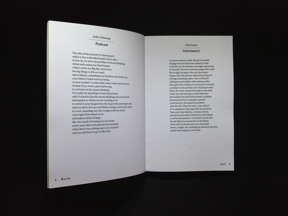 Rattle以四次發行,現在在3月、6月、9月和12月出版。每一期大約有100頁的詩歌和一位當代詩人的採訪。大多數每期都有一個向偉大人物致敬的部分,可能是一個特定的文體、種族或是工作形態。最近的焦點榨多數放在非洲裔美國詩人、牛仔詩人、視覺詩歌和護士。