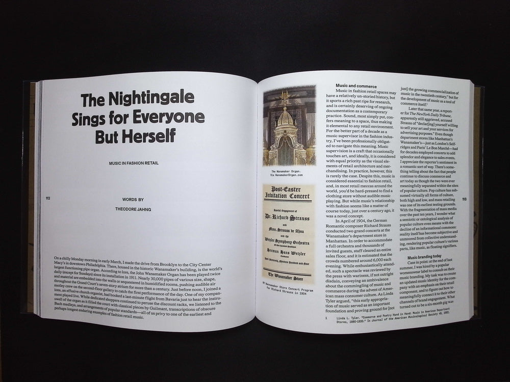 《Viscose Journal》第八期以聲音為主題,探討時尚、藝術與聲響之間的流動關係。封面以留白圓痕象徵唱片與時間的軌跡,內頁收錄藝術家、音樂人與理論家的跨界對談,從錄音文化到聲音裝置,思考「聽覺」如何形塑感知與記憶。本期延續刊物對時尚思想的實驗性精神,以極簡視覺與概念性排版呈現,將閱讀轉化為一次關於「聲音之形」的沉靜體驗。