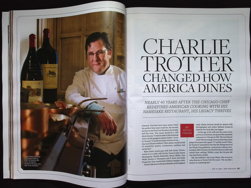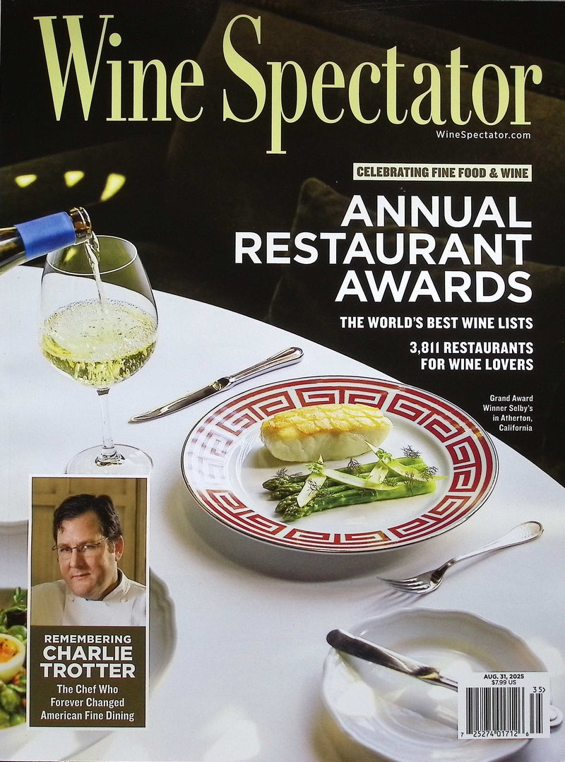 《Wine Spectator》2025年8月31日號公布年度餐廳大獎,精選3,011間擁有頂級酒單的美食名店,封面為獲得最高榮譽的加州Healdsburg餐廳SingleThread之菜餚。內容深入介紹餐廳團隊與酒窖特色,並特別紀念美國餐飲界傳奇人物Charlie Trotter,回顧其對高端餐飲的深遠影響。
